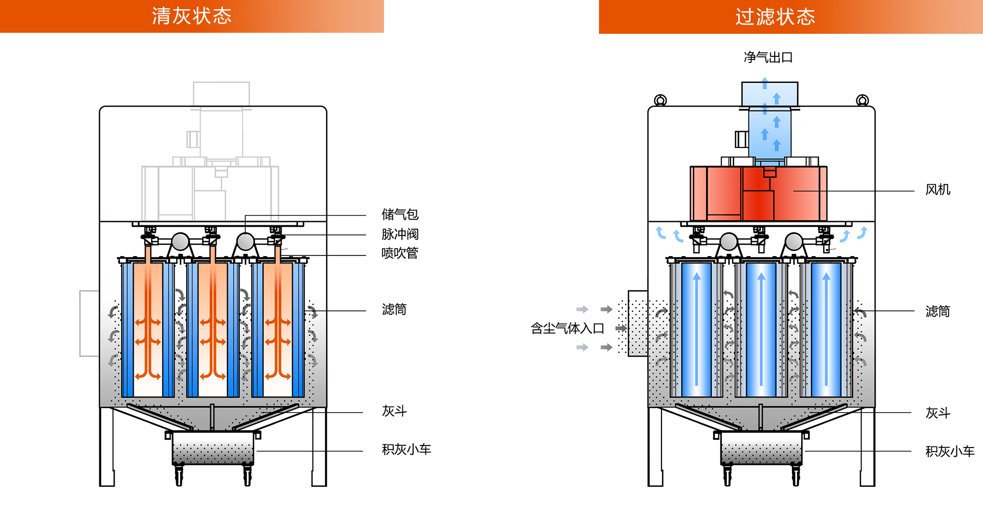 通過反復(fù)小幅度的沖擊振動,將積聚在濾筒外部的粉塵震落至灰斗內(nèi)。